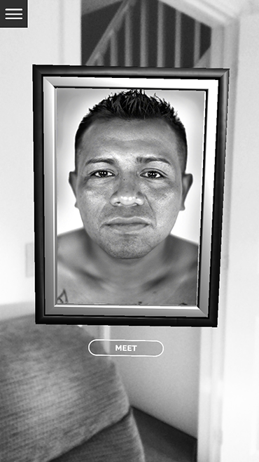 As soon as opening the app, I was asked to allow the app to use the camera, after accepting this I was then asked to use headphones and move to a place where there would be enough room to move around freely. Then the back camera of my phone was on to use my space to create the backdrop of the project interface. By moving in 360 degrees I was able to see photos of 6 different fighters with a name under each photo. A voice over recorded by the author was accompanying this asking me to choose which fighter I wish to learn more about and gain further insights into his story.