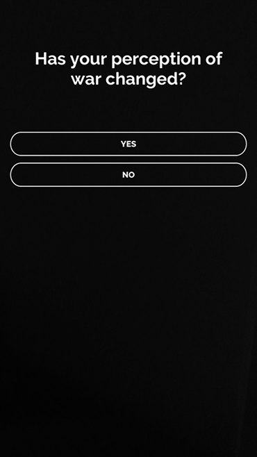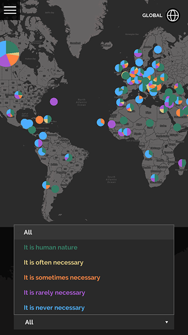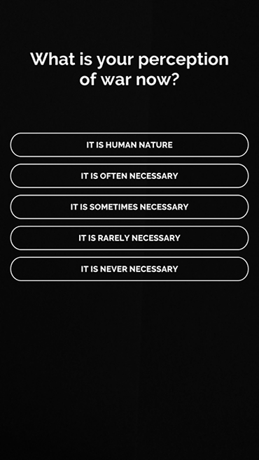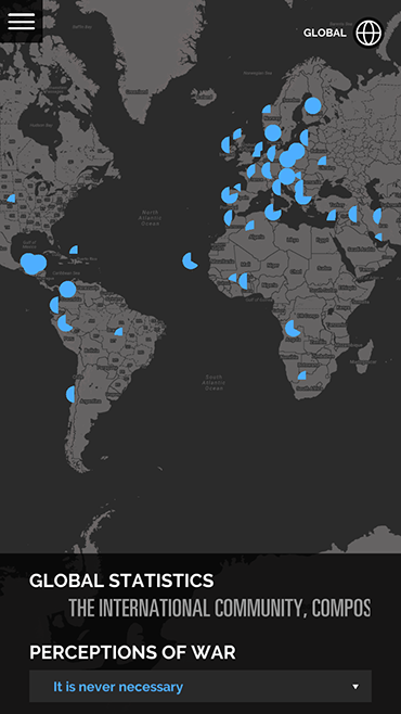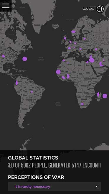 There was another screen which is a map, where I could choose to use it personal or global. When I chose global it showed me the different perceptions of war on the map in different locations and I could filter it based on a specific perception, this gave an idea about how people in different location think about war or in more correct way how the people thinking about the war after this project. It could be better if they add numbers not only charts or points that would give more accurate information.