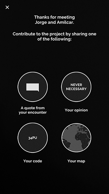At the end of each interaction with the character and his enemy, there were prompts to find out about the user’s feelings after hearing the two different perspectives and there were 4 different ways to engage more with the story by; sharing a quote from the encounter, sharing my code, sharing my opinion and sharing my map. However, I don’t think it works well as there is no description about what my code means also some of the options didn’t work.
